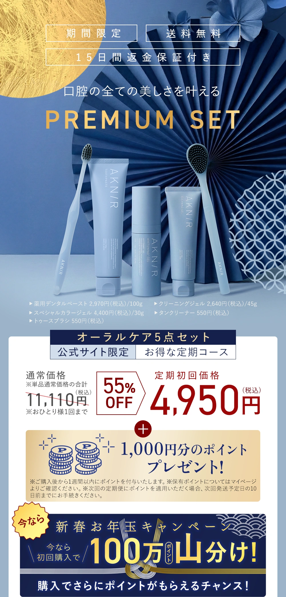■2回目以降は薬用デンタルペースト1本あたり2,299円(税込)、スペシャルカラージェル1本あたり3,388円(税込)、トゥースブラシ1本あたり275円(税込)、クリーニングジェル1本あたり2,068円(税込)、タンクリーナー1本あたり275円(税込)各2本分を通常価格から約25%OFFの合計16,610円(税込)でお届けいたします。