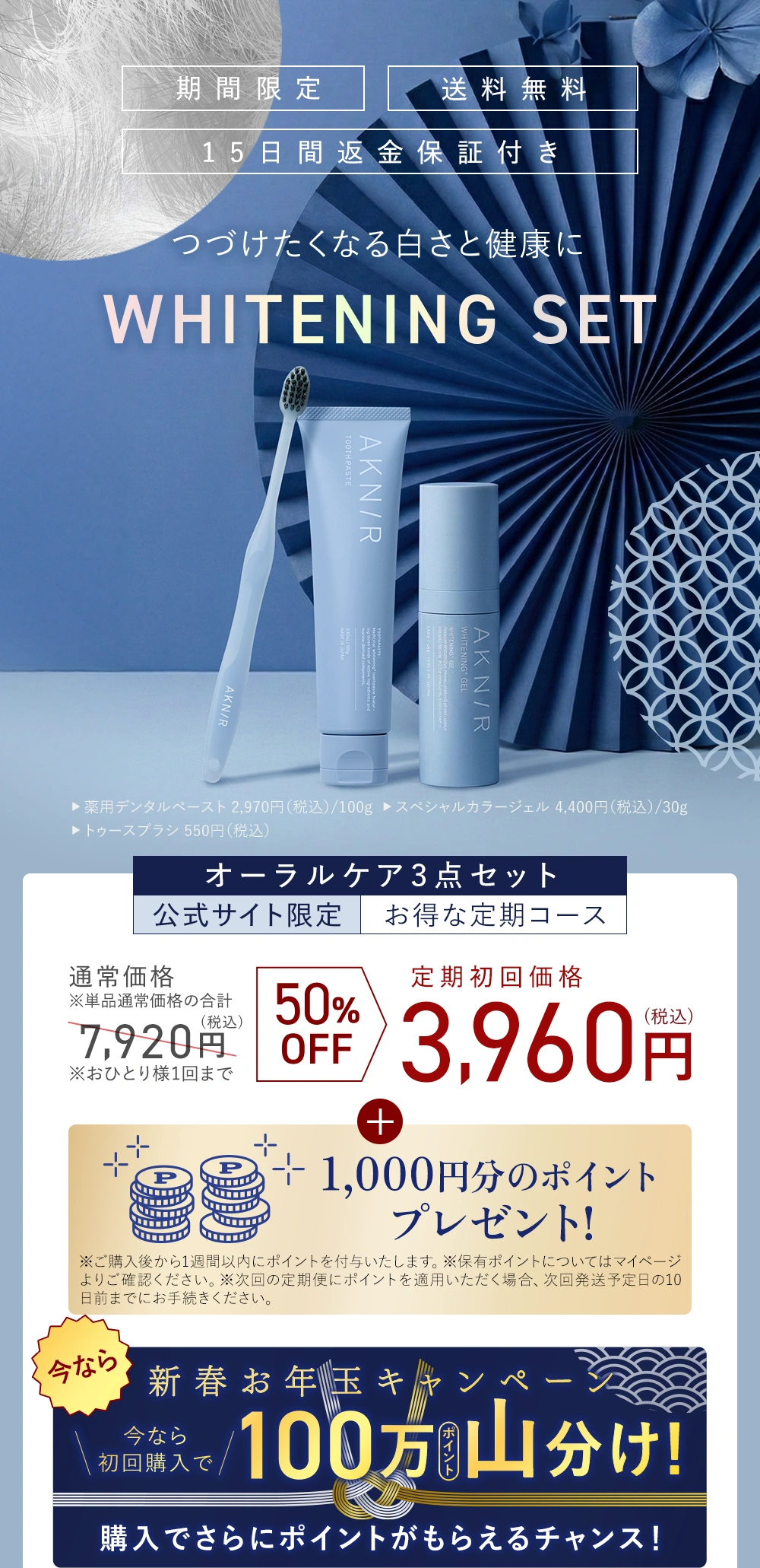 ■初回価格3,960円(税込)で薬用デンタルペースト(100g)、スペシャルカラージェル(30g)、トゥースブラシを各1本ずつお届けいたします。
