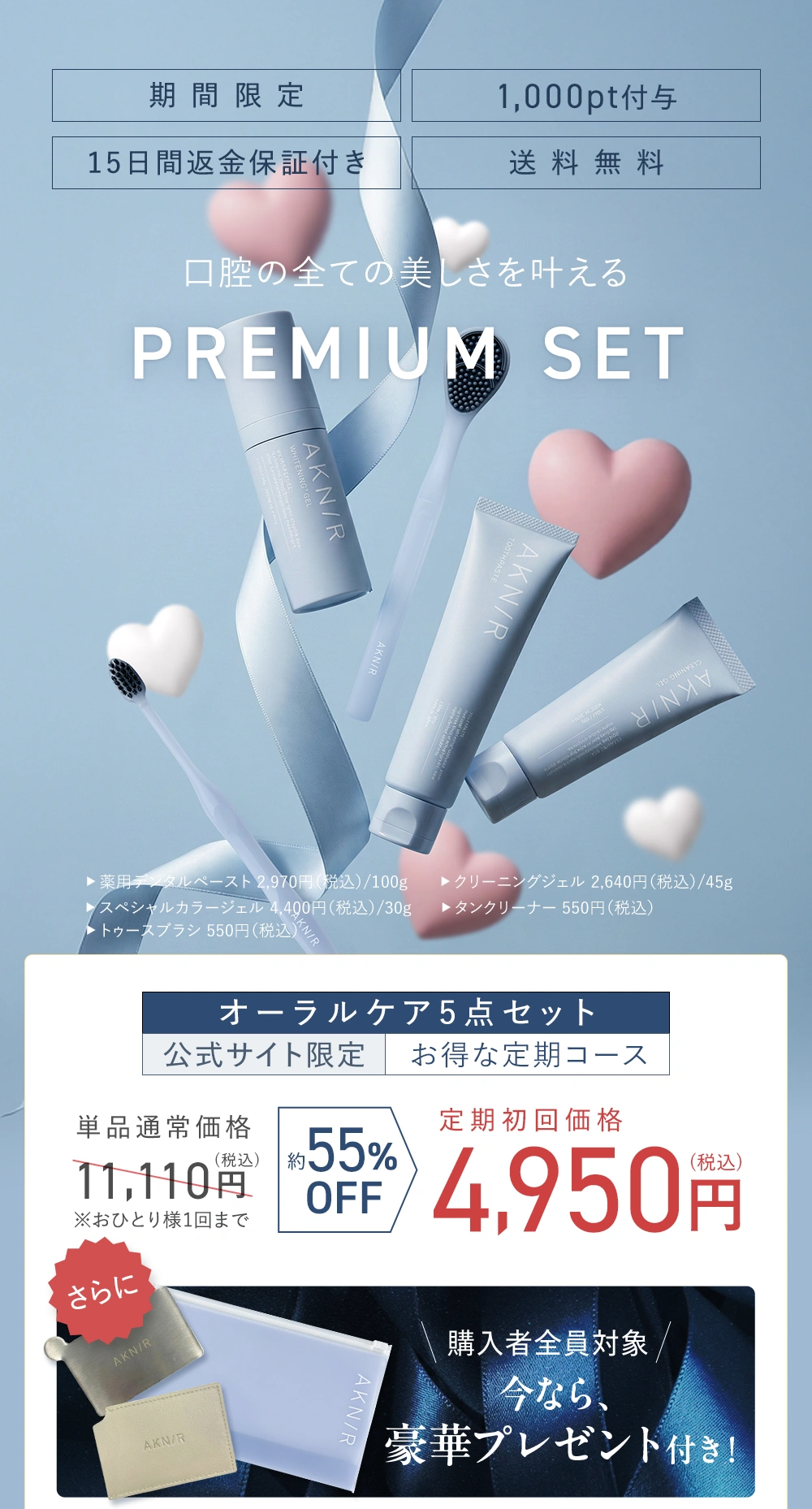 ■2回目以降は薬用デンタルペースト1本あたり2,299円(税込)、スペシャルカラージェル1本あたり3,388円(税込)、トゥースブラシ1本あたり275円(税込)、クリーニングジェル1本あたり2,068円(税込)、タンクリーナー1本あたり275円(税込)各2本分を通常価格から約25%OFFの合計16,610円(税込)でお届けいたします。