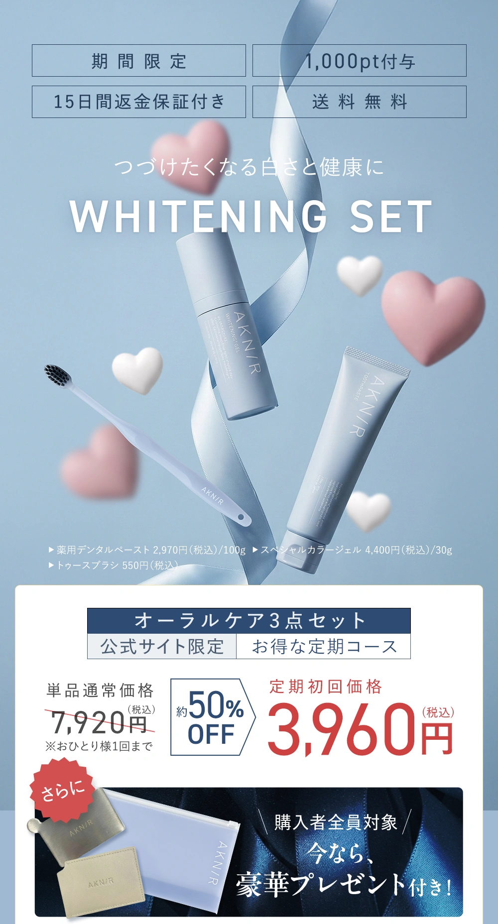 ■初回価格3,960円(税込)で薬用デンタルペースト(100g)、スペシャルカラージェル(30g)、トゥースブラシを各1本ずつお届けいたします。
