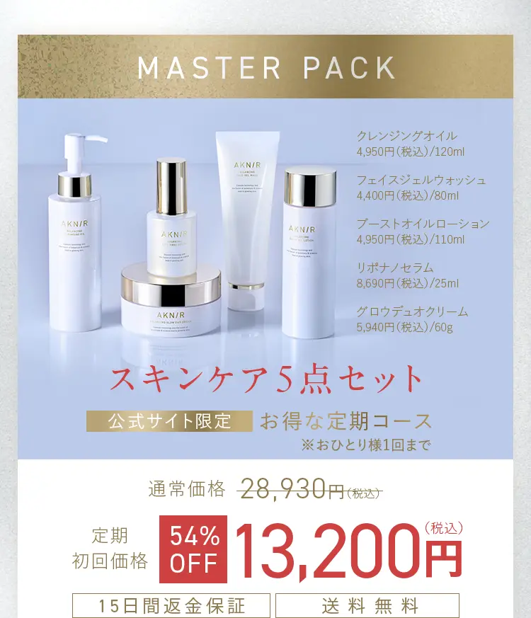 ■2回目以降はクレンジングオイルを税込3,465円、フェイスジェルウォッシュを税込3,080円、ブーストオイルローションを税込3,465円、リポナノセラムを税込6,083円、グロウデュオクリームを税込4,158円の各1本ずつを30%OFFの合計20,251円(税込)でお届けいたします。