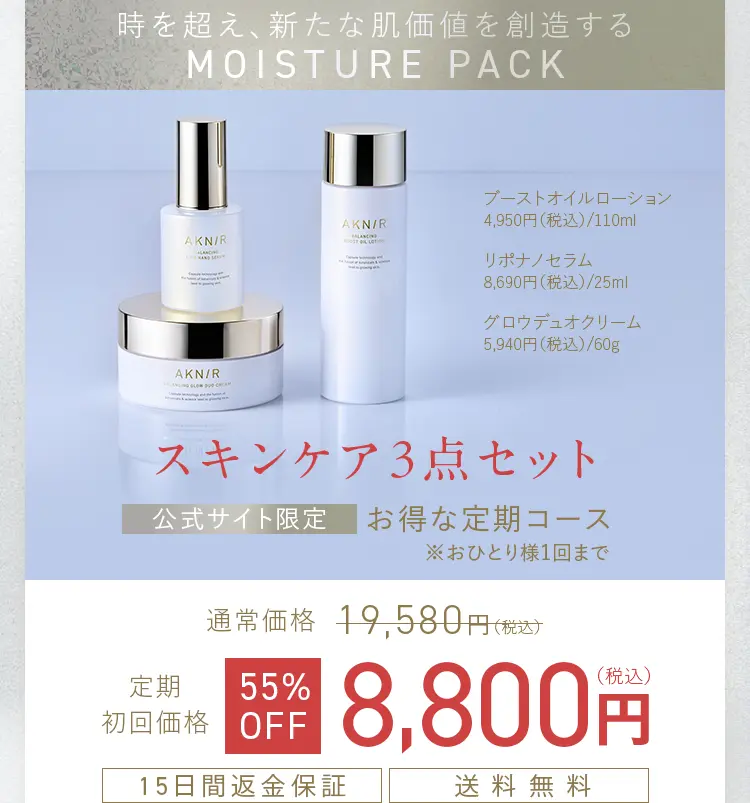■初回価格8,800円(税込)でブーストオイルローション(110ml)、リポナノセラム(25ml)、グロウデュオクリーム(60g)を各1本ずつお届けいたします。