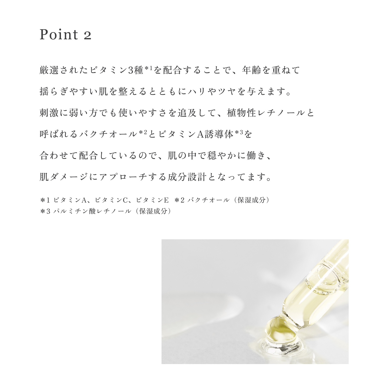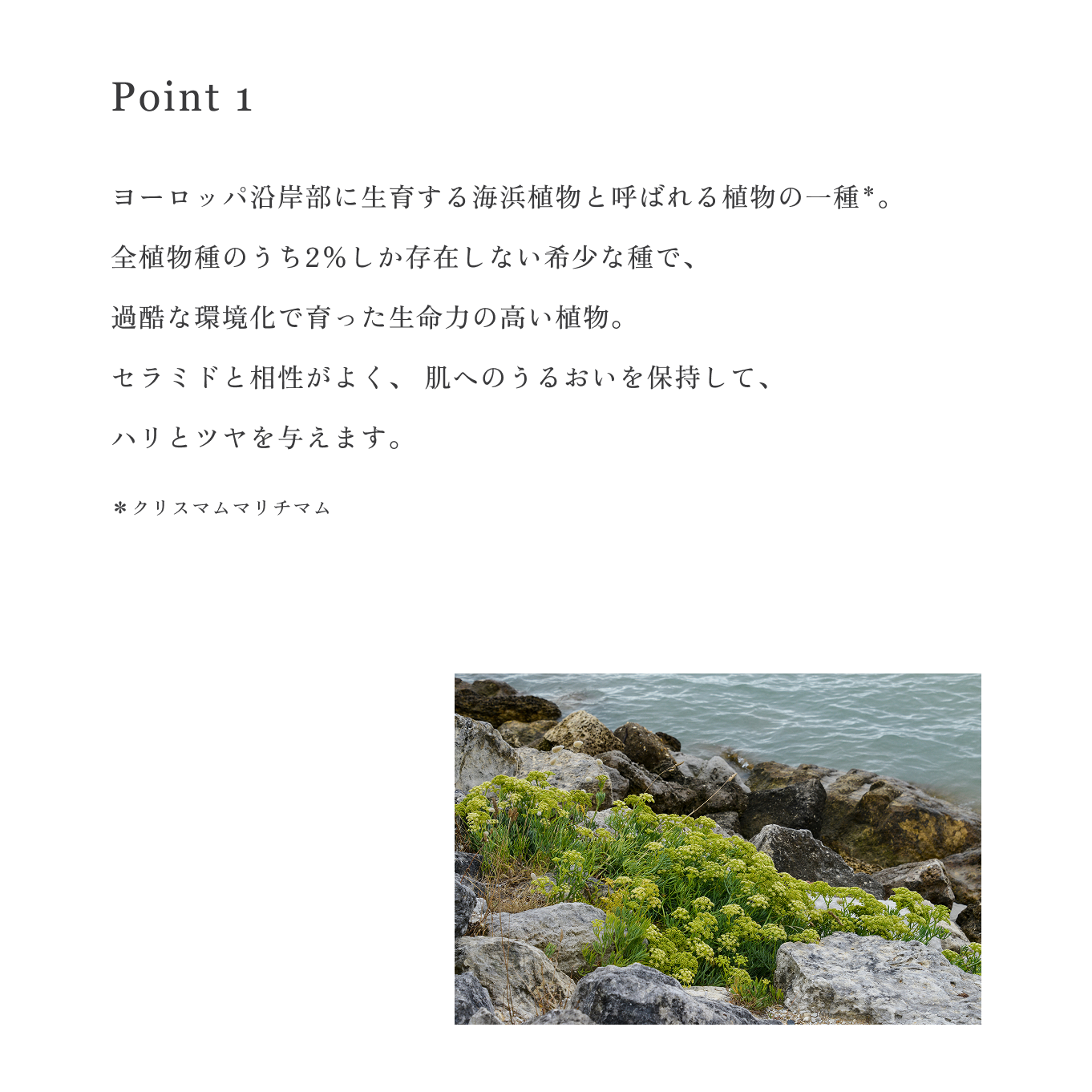 スクワラン、ホホバ種子油、アボカド油、テトラヘキシルデカン酸アスコルビル、ラウロイルグルタミン酸ジ(フィトステリル/オクチルドデシル)、トコフェロール、ラウロイルサルコシンイソプロピル、ココヤシ果実エキス、トリ(カプリル酸/カプリン酸)グリセリル、バクチオール、酢酸トコフェロール、セイヨウアブラナ種子油、ライム油、レモン果皮油、クロフサスグリ種子油、オクチルドデカノール、オレイン酸オクチルドデシル、コリアンダー種子油、ステアロイルオキシステアリン酸オクチルドデシル、テリハボク種子油、クリスマムマリチマムエキス、ビサボロール、パルミチン酸レチノール、コーン油、マスチック樹脂、ボタンエキス、トマト果実エキス、ローズマリー葉エキス、セラミドNG、セラミドNP、セラミドAG、パルミチン酸アスコルビル、アスコルビン酸、デュナリエラサリナエキス、レシチン